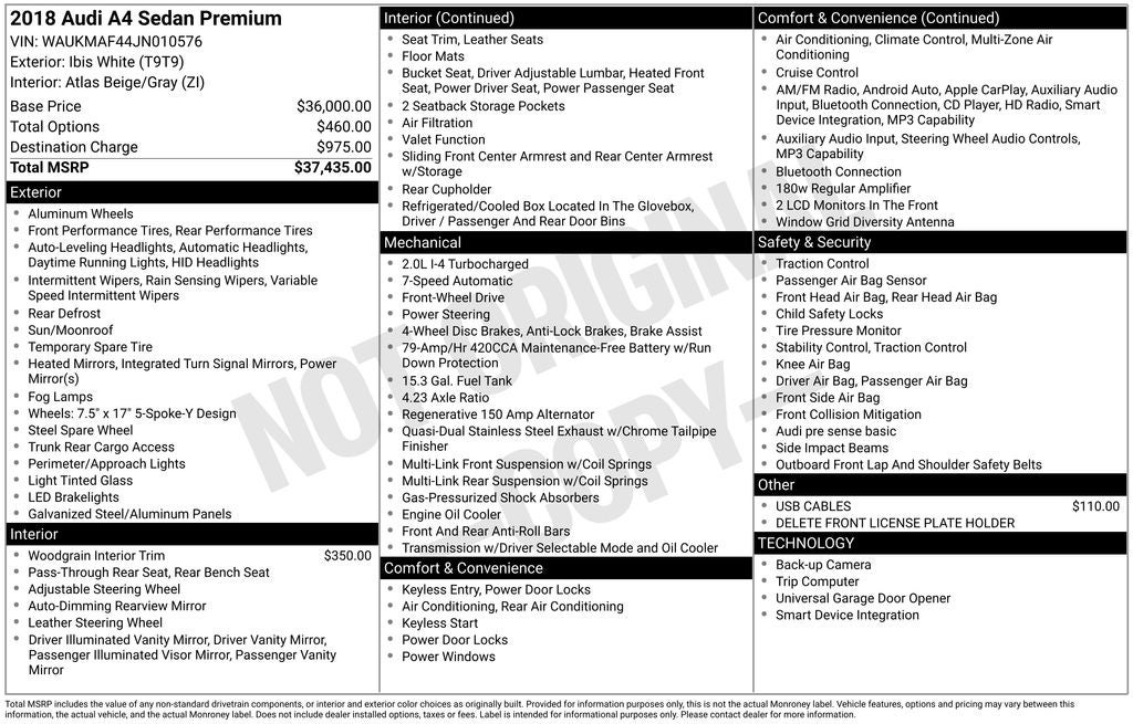 2018 Audi A4 Ibis White 2.0T ultra Premium FrontTrak 7-Speed Automatic S tronic 2.0L I4 TFSI DOHC 7-Speed Automatic S tronic, Atlas Beige/Gray w/Leather Seating Surfaces, Air Conditioning, Audi smartphone interface (Apple CarPlay/Android Auto), Exterior Parking Camera Rear, Front dual zone A/C, Heated front seats, Leather Seating Surfaces, Power driver seat, Power moonroof, Power passenger seat, Radio: Audi MMI Navigation Plus w/MMI Touch, Rear air conditioning, Remote CD player, Wheels: 7.5 x 17 5-Spoke-Y Design.