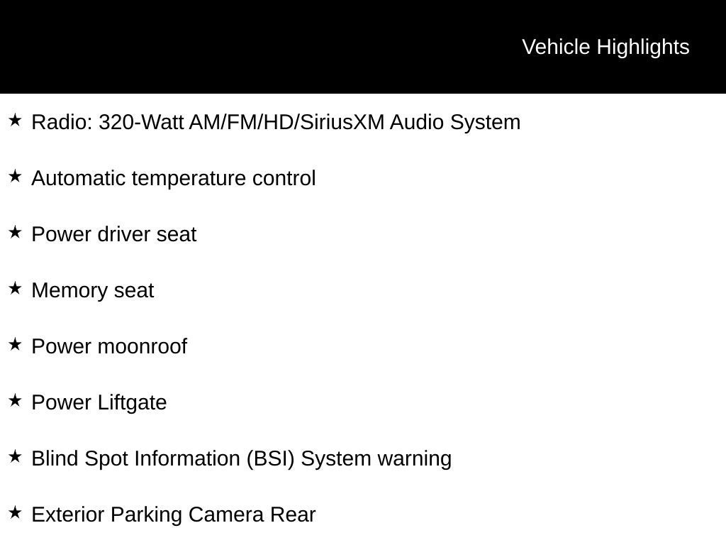 • Radio: 320-Watt AM/FM/HD/SiriusXM Audio System -inc: 9" color touchscreen, 8 speakers, Apple CarPlay and Android Auto compatibility, wireless Apple CarPlay compatibility, wireless Android Auto compatibility, Bluetooth® streaming audio and USB-A 2.5A smartphone/audio interface in front seats, All SiriusXM services require a subscription, sold separately by SiriusXM after the trial period, If you decide to continue service, the plan you choose will automatically renew at the then-current rates, Fees and taxes apply, See the SiriusXM customer agreement and privacy policy at www.siriusxm.com for full terms and how to cancel, which includes calling 1-866-635-2349, Available in the 48 contiguous U.S, and D.C, Some services and features are subject to device capabilities and location restrictions, All fees, content and features are subject to change